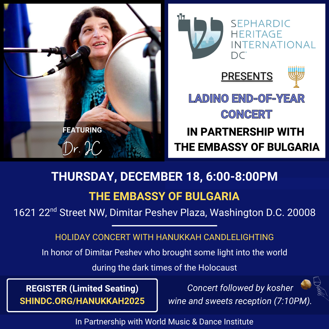 Ladino End-of-Year Concert with SHIN-DC and the Embassy of Bulgaria Dec 18 6:00 PM - 8:00 PM Community Calendar Ladino End-of-Year Concert with SHIN-DC and the Embassy of Bulgaria $15 – $18