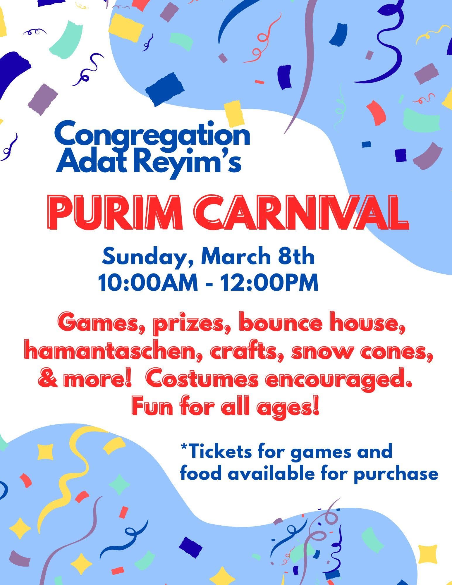 The purim fun continues this weekend! Please join us at Congregation Adat Reyim for our purim carnival.
