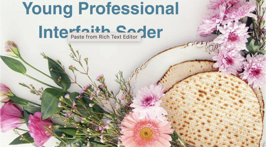 Young Professionals Interfaith Seder Apr 19 Young Professionals Interfaith Seder 5:30 PM - 8:30 PM $18